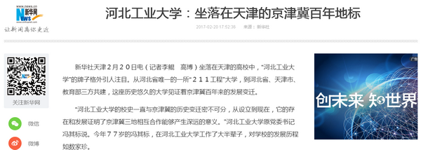 2月20日,新华社发布电文《河北工业大学:坐落在天津的京津冀百年地标》,报道了我校由1903年创办的北洋工艺学堂,成长为河北省唯一的“211工程”大学,再到步入河北省、天津市、教育部三方共建的世纪历程,讲述了一所百年高校与京津冀历史变迁密不可分的地缘血脉,点明了在京津冀协同发展国家战略的时代背景下,一所“地标”学府所应有的担当和使命!