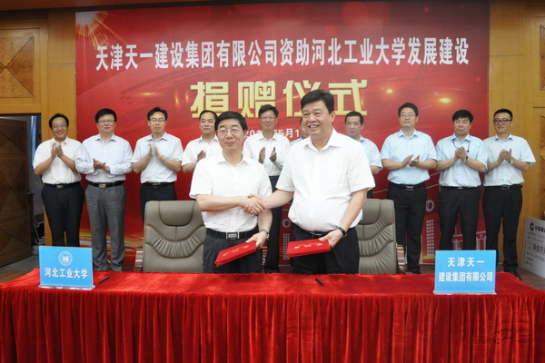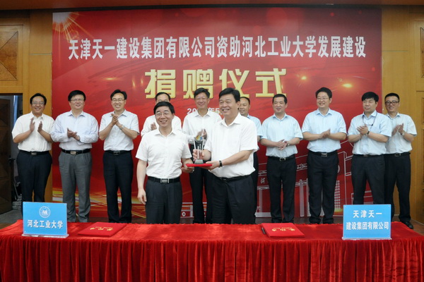 天一建设集团是天津建筑市场的旗舰企业,国内建筑业3A级信用企业、全国建筑业先进企业,多次获得天津市优质工程金奖——海河杯工程奖、中国建筑行业最高奖——鲁班奖等百余项大奖。长期以来,该企业与我校精诚合作,保持着密切、良好的关系。此次捐赠,也是继2006年在土木与交通学院设立郭中朝奖教、奖学基金,2011年双方签署校企战略合作,“天一奖助学金”“天一艺术基金”协议,2013年我校 110年校庆捐建北辰校区的地标建筑——工学楼,开展多层次、多角度、多领域合作探索之后,双方在求同文化、加深校企合作的又一重大举措。