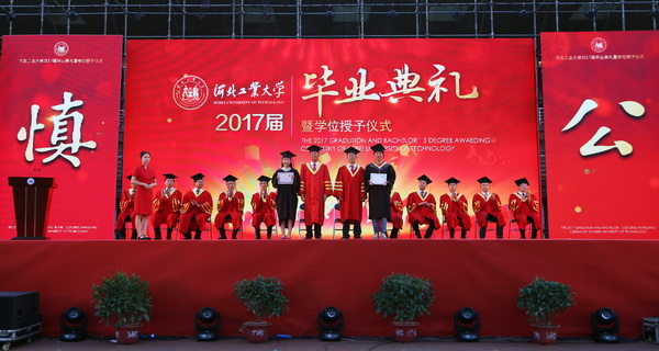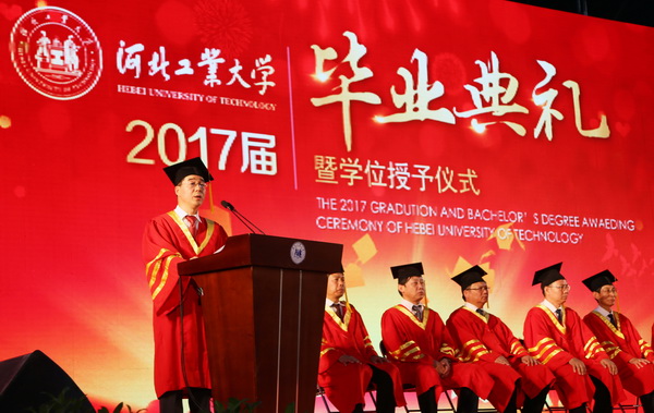 毕业典礼在庄严的国歌声中拉开帷幕。副校长刘兵代表学校宣读了河北工业大学学位评定委员会关于授予学位的决定。城市学院院长王艳廷宣读了河北工业大学城市学院学位评定委员会关于授予学位的决定。校党委书记李强教授,校党委副书记、副校长韩旭教授为博士生代表、硕士研究生代表以及本科生代表颁发毕业证、学位证。